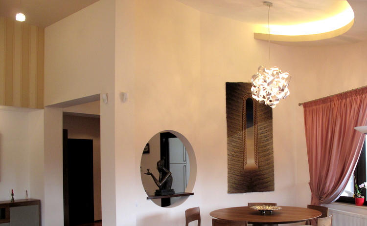 Proiectul de amenajare a fost realizat in 10 luni, casa fiind amplasata pe un teren generos. Cateva din particularitatile proiectului au fost terasa acoperita si living-ul cu inaltimea de peste 4m.